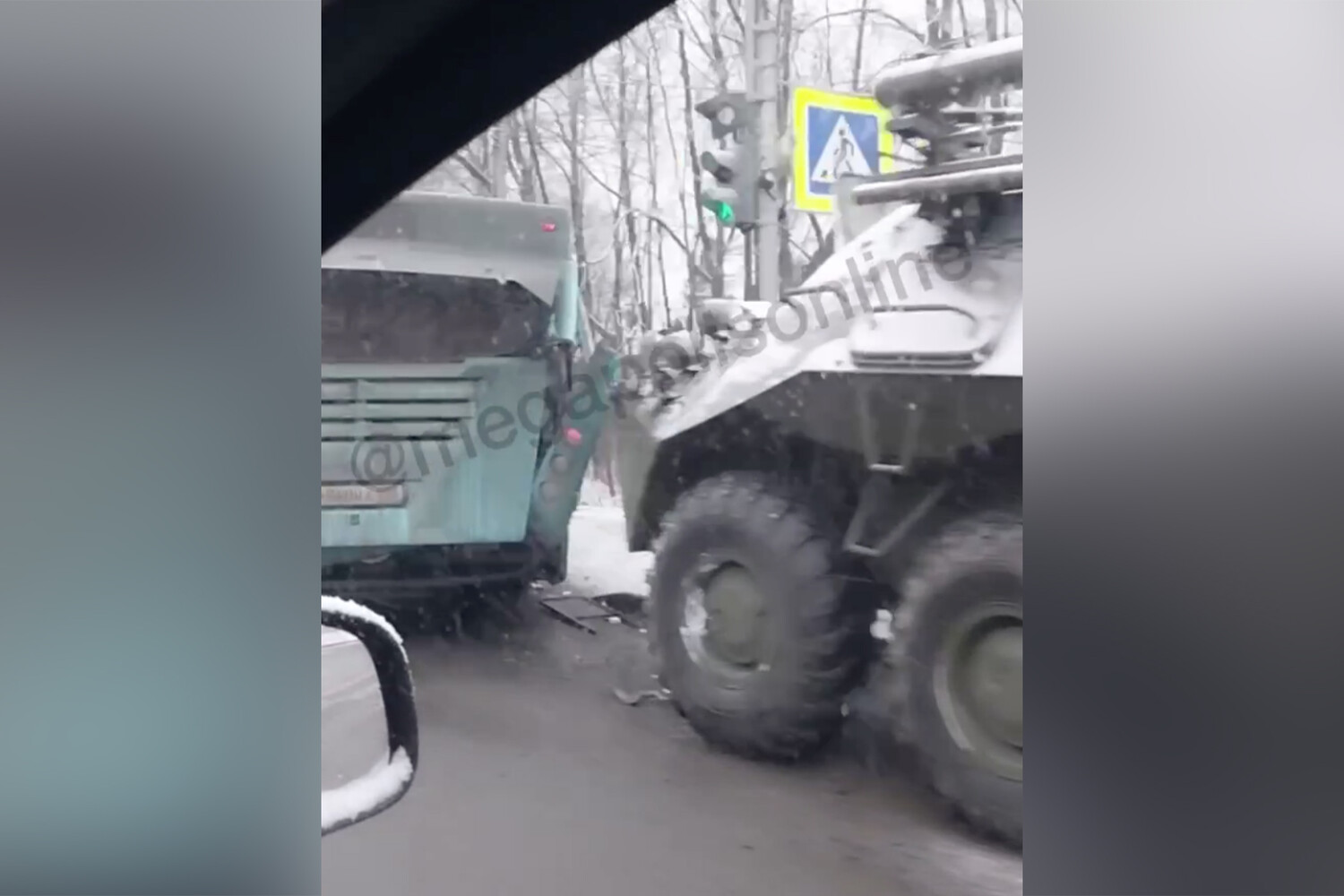 Инцидент произошел на пересечении улицы Песочной и Выборгского шоссе. Судя по видео, автобус поворачивал направо на перекрестке, когда в его заднюю часть въехал бронетранспортер. У автобуса повреждена кузовная деталь, в которую вмонтирован фонарь и стоп-сигнал. У военной машины повреждений нет.