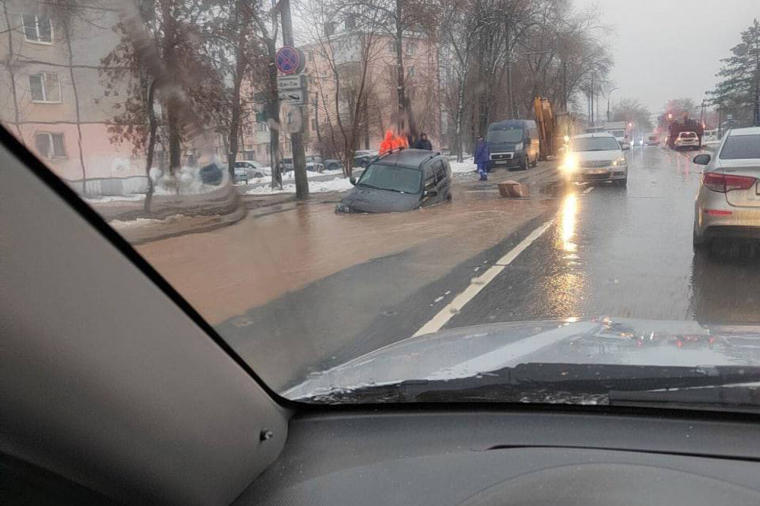 Позже к месту происшествия подъехал экскаватор, который помог водителю вытащить его автомобиль из залитой водой ямы.