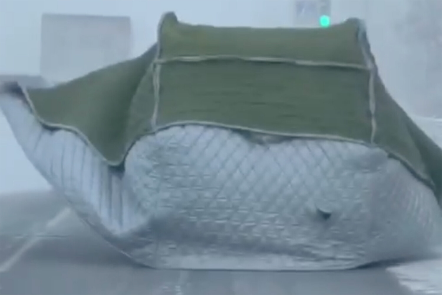 На записи от очевидцев местный автомобилист решил не сбрасывать утепление и выехал на дорогу прямо в мягком гараже.