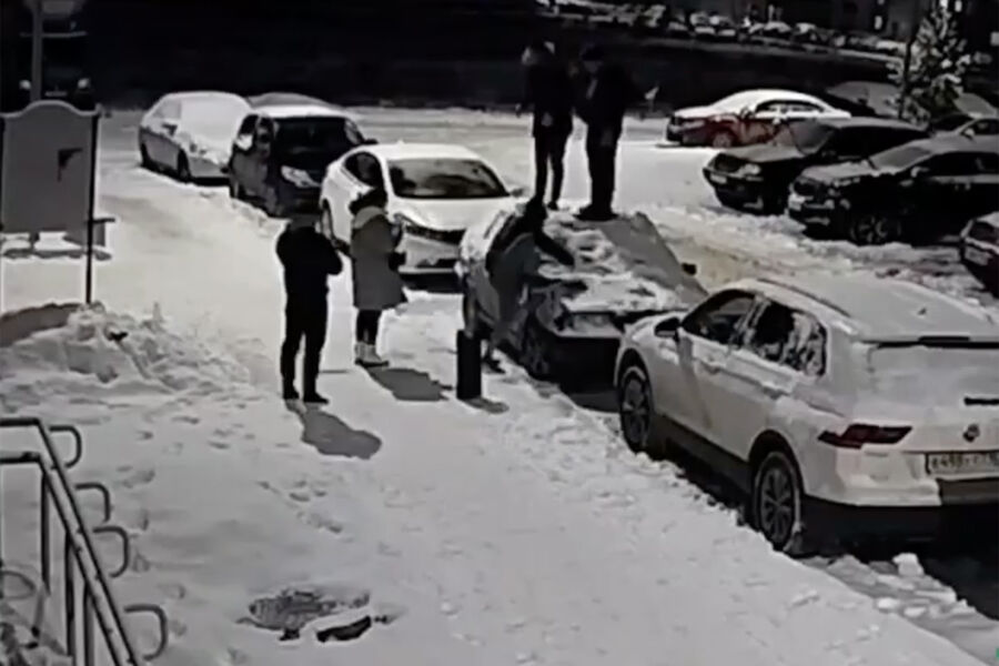Судя по видео, компания из нескольких молодых людей стоит у машины и распивает напитки. Затем трое мужчин забираются на автомобиль и начинают танцевать. При этом еще один гражданин пытается залезть на машину, но падает.