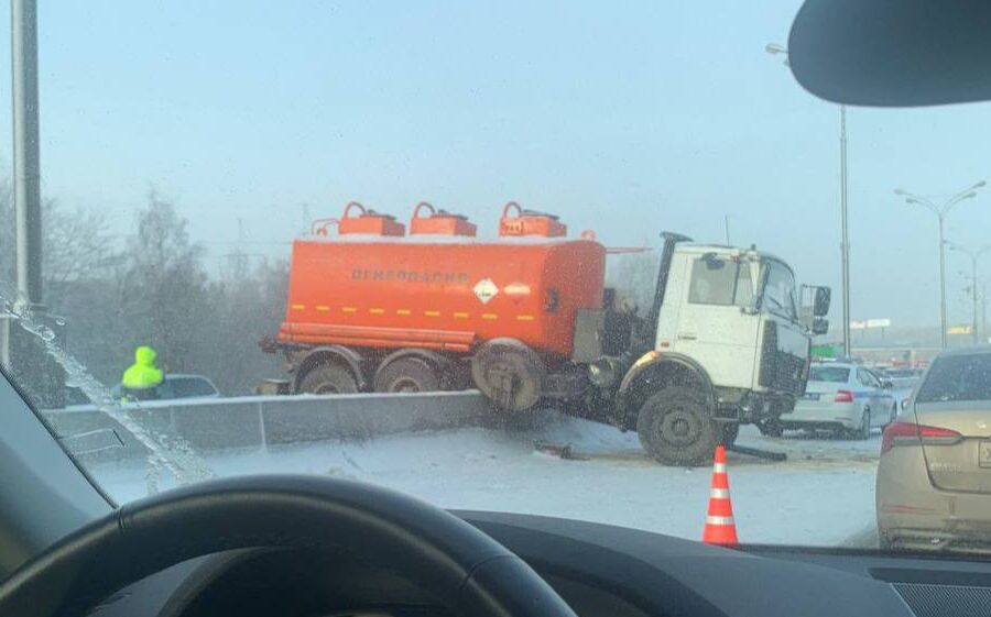 На 103-м километре МКАД водитель бензовоза не справился с управлением, в результате чего автомобиль застрял на разделительном отбойнике, сообщается в Telegram-канале »Москва с огоньком».