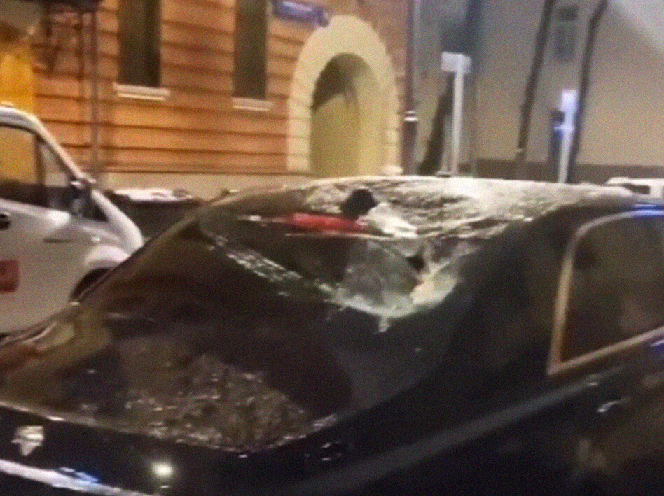 На видеозаписи с последствиями происшествия видно, что припаркованный в переулке среди застройки исторического центра Москвы седан Aurus Senat получил значительные механические повреждения крыши. На нем видны куски льда и вмятины. Наиболее сильно пострадала задняя часть автомобиля. Кроме того, у автомобиля оказалось разбито заднее стекло. Номерные знаки на поврежденном Aurus Senat отсутствуют.