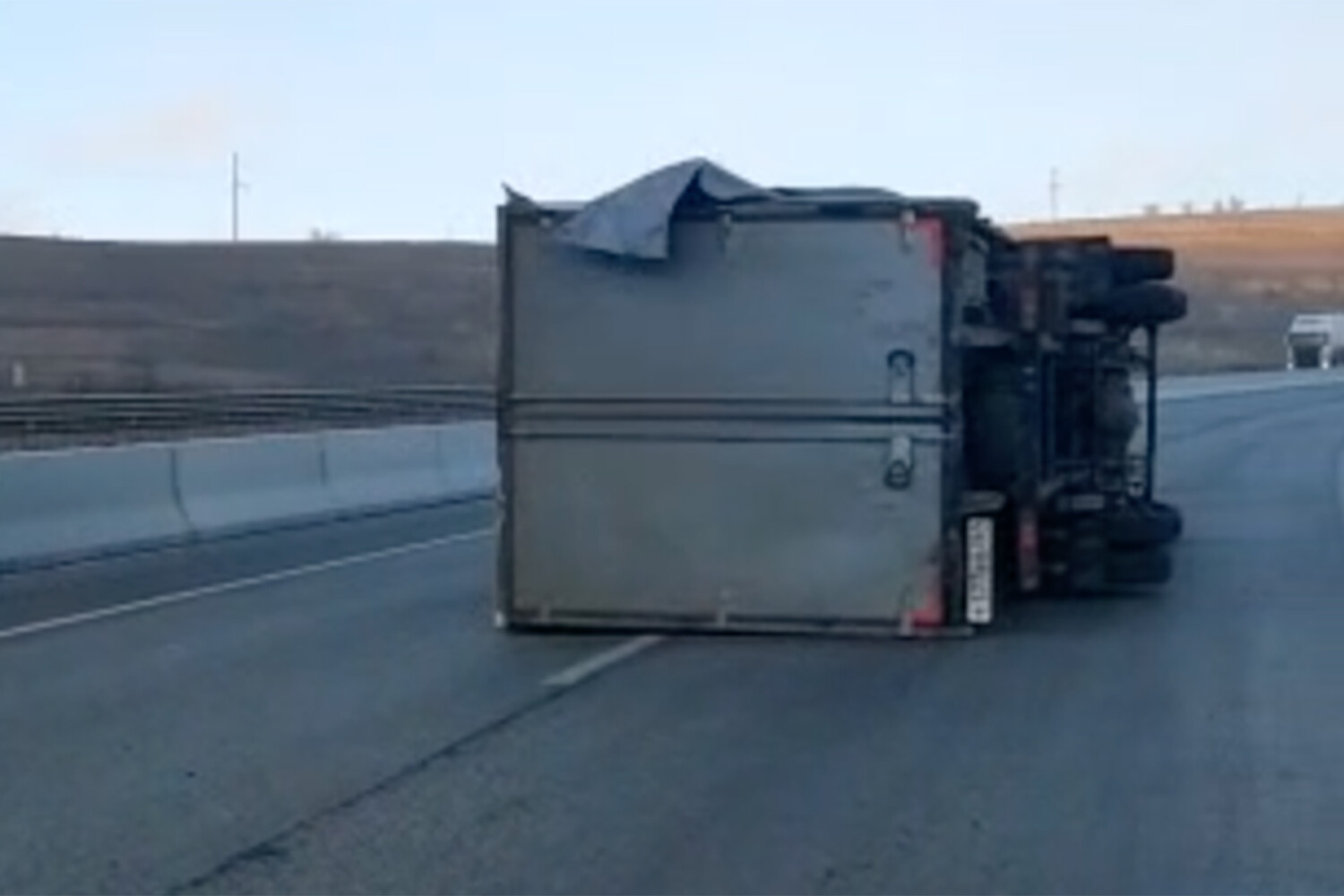 На подъезде к Ставрополю сильный ветер опрокинул грузовой автомобиль, сообщается в Telegram-канале «Госавтоинспекция Ставрополья».