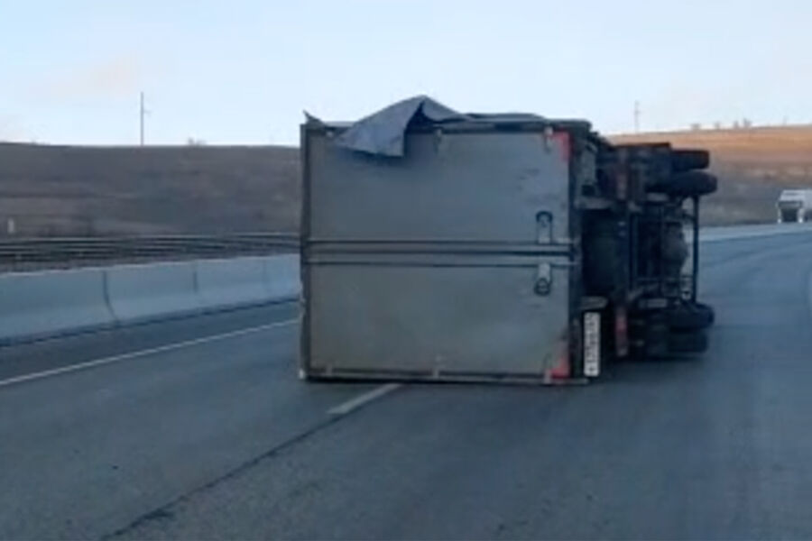 На видеозаписи с места происшествия видно, что крытый грузовой автомобиль опрокинулся на левый бок. Тент машины оказался сорван с креплений порывами ветра.