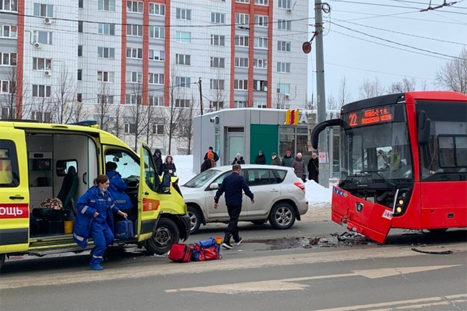 По предварительным данным, «скорая» с включенной сиреной и мигалкой выехала на встречную полосу и лоб в лоб врезалась в городской автобус. От удара у обоих транспортных средств сильно повреждены передние части. В городском автобусе никто не пострадал, уточнили изданию в ассоциации автотранспортных перевозчиков Татарстана.