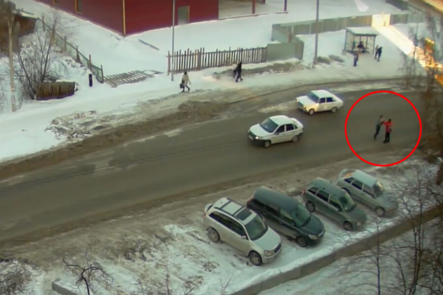Инцидент случился в Ревде на улице Карла Либкнехта. На записи видно, как водитель белой легковушки выходит из салона и набрасывается на пешехода в красной куртке, который идет по проезжей части, бьет его руками и ногами, пока тот не падает на дорогу. В конце видео напавший на пешехода мужчина садится обратно за руль и уезжает, но рядом останавливается белая иномарка.