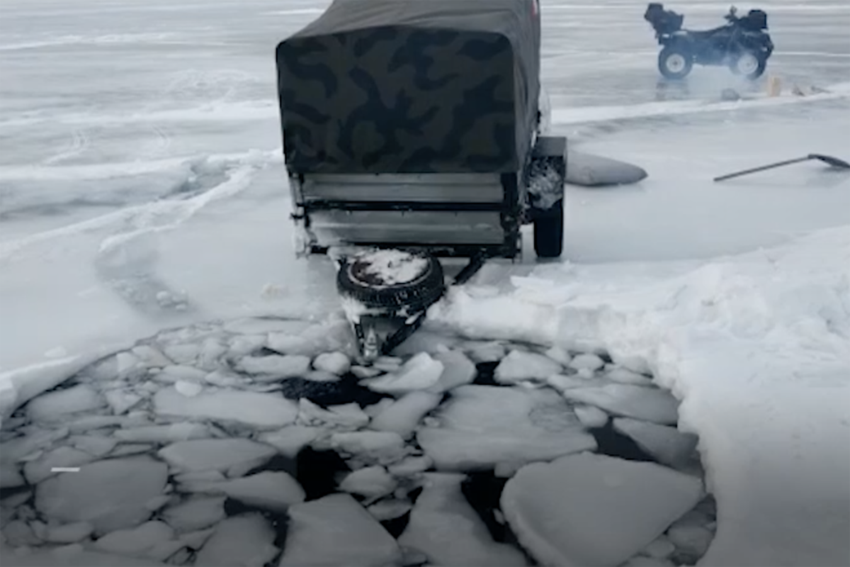 Инцидент произошел в Ольхонском районе Иркутской области. Судя по видео и словам очевидцев, на поверхности остался только прицеп, сам автомобиль теперь находится на дне.