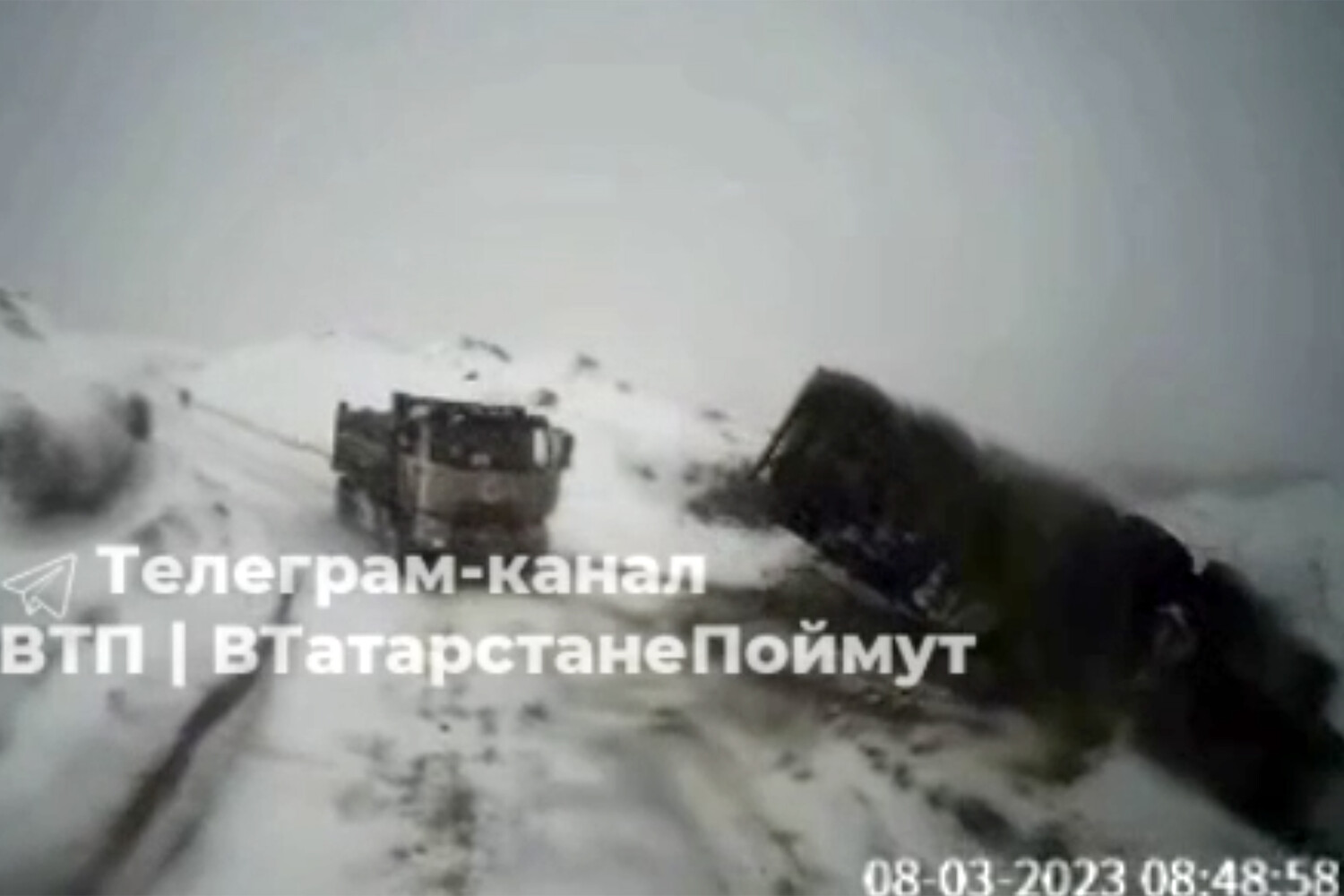 На видеозаписи с места происшествия видно, что один из большегрузов движется задним ходом и переворачивается вверх колесами, свалившись с откоса. Вслед за ним еще один самосвал врезается в первый и тоже сваливается с дороги, повиснув на краю кювета.