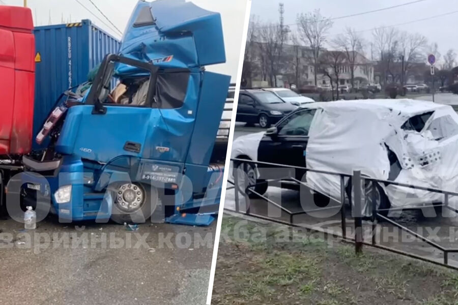 На видео с последствиями ДТП, опубликованном Telegram-каналом «Автогарант», видно, что грузовик перевозил новые автомобили, упакованные в транспортировочные чехлы. После инцидента их выгрузили с полуприцепа. Минимум одна из перевозимых машин получила серьезные повреждения, у нее смят левый угол кузова сзади.