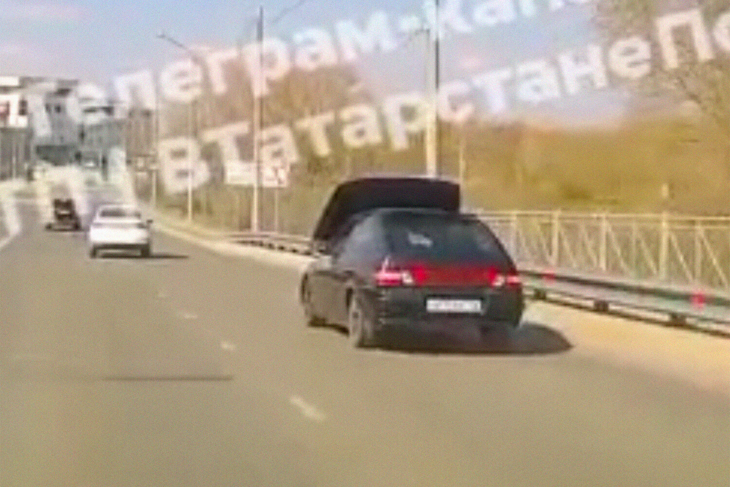 Очевидцы сняли на улицах Казани автомобиль ВАЗ-2112, водитель которого ехал по городской улице с открытым капотом, перекрывшим обзор. Об этом сообщает Telegram-канал «В Татарстане поймут» и публикует видеозапись инцидента.