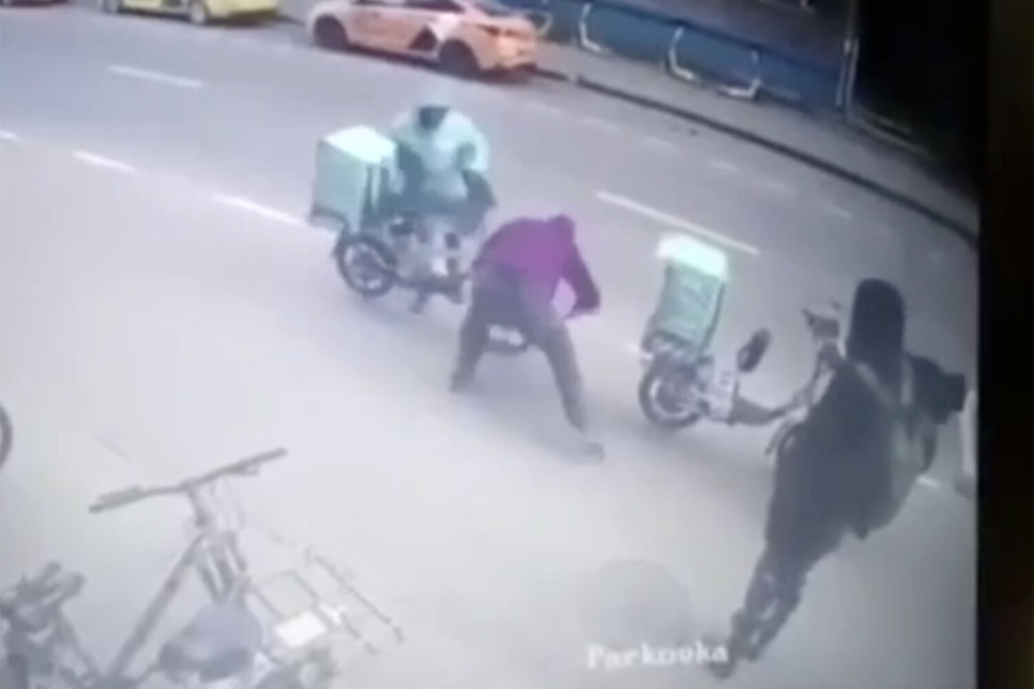 На видеозаписи инцидента видно, что два человека в капюшонах прокололи колеса у припаркованного электровелосипеда с кофром для доставки товаров, а затем сделали то же самое с другим велосипедом, у которого находился курьер в форменной зеленой куртке. Третий молодой человек при этом снимал происходящее на видео.