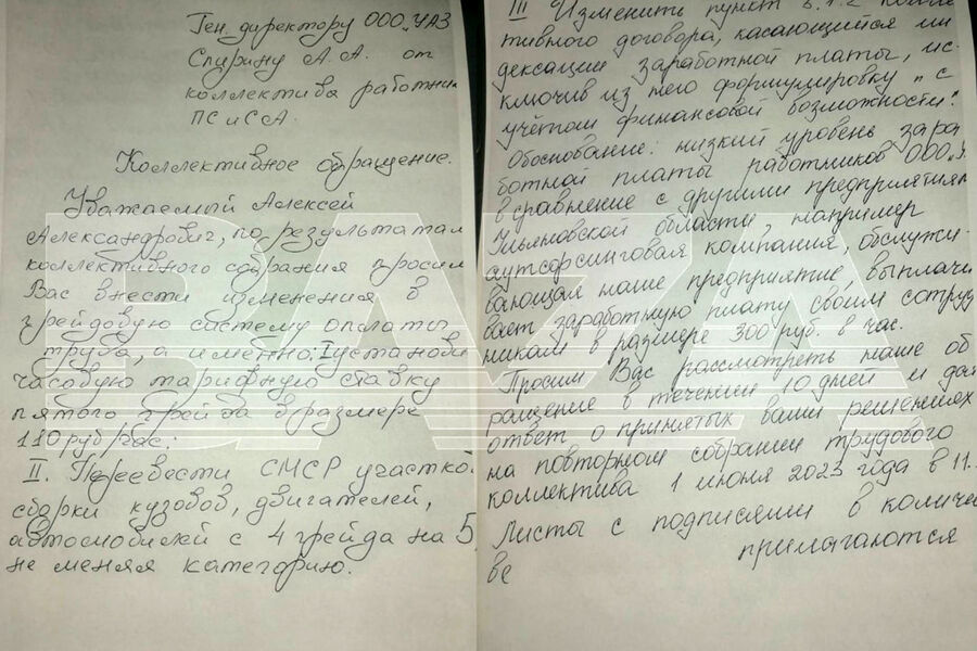 Работники Ульяновского автозавода устроили массовое собрание в одном из цехов 17 мая, оно продлилось до вечера. По итогам сотрудники написали коллективное обращение к гендиректору, потребовав увеличить почасовые ставки и оплату труда, а также изменить пункт договора о выплате зарплат, убрав оттуда формулировку «c учетом финансовых возможностей».