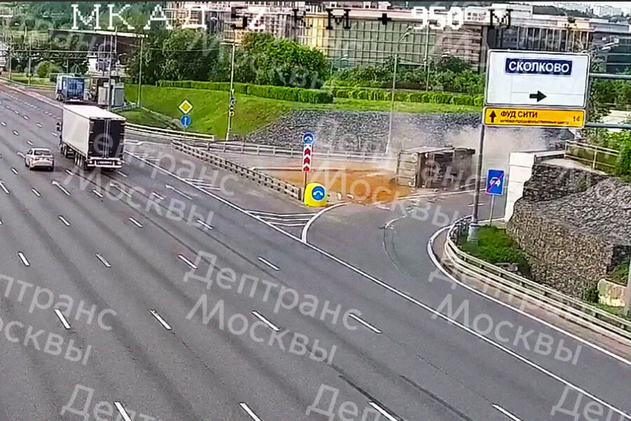 Судя по видео, самосвал на высокой скорости пытался съехать с МКАД в сторону Сколково, однако накренился и завалился на левый бок. До опрокидывания у него лопнуло заднее колесо.