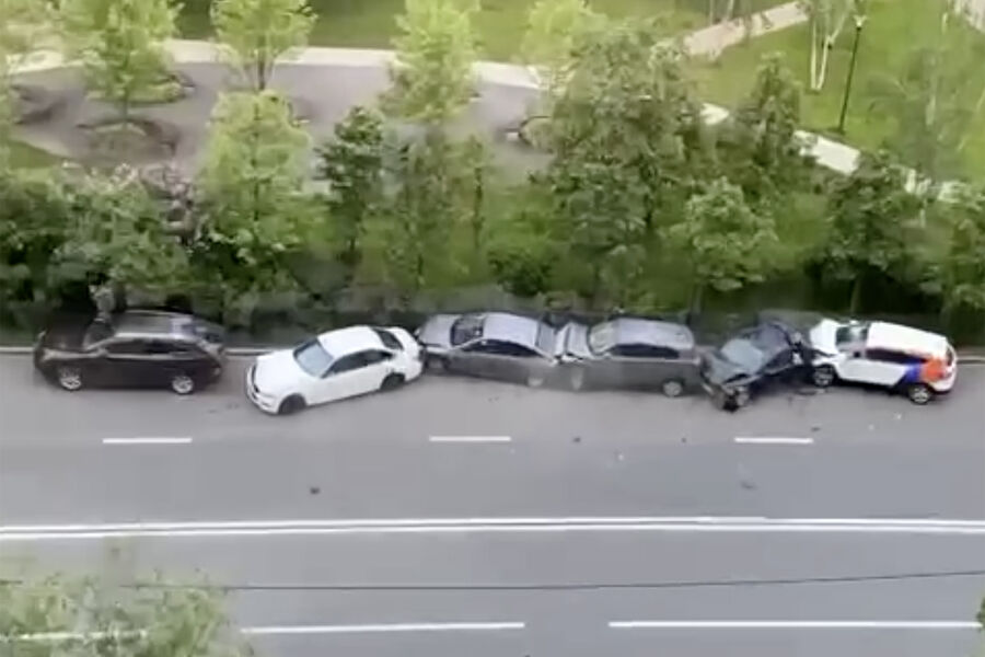 Момент массовой аварии с участием автомобиля каршеринга на Митинской улице в Москве попал на видео, запись опубликовал Telegram-канал 112.