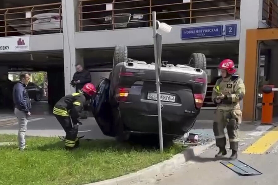Автомобиль упал с третьего этажа парковки на Новодмитровской улице в Москве. Об этом сообщает Telegram-канал «Что там в Москве?».