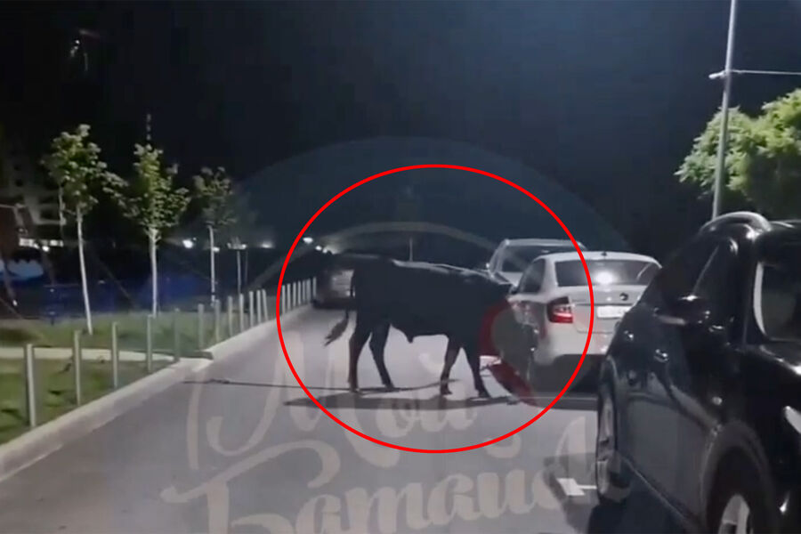 На кадрах видно, что животное приближается к автору видео и агрессивно мычит. Затем бык боднул рогами заднее крыло припаркованной Skoda Rapid белого цвета. Впоследствии местным жителям удалось поймать быка и привязать его в отдалении от машин. По словам очевидцев, во время прогулки по парковке бык с обрывком привязи успел повредить много машин. Хозяин животного не найден.