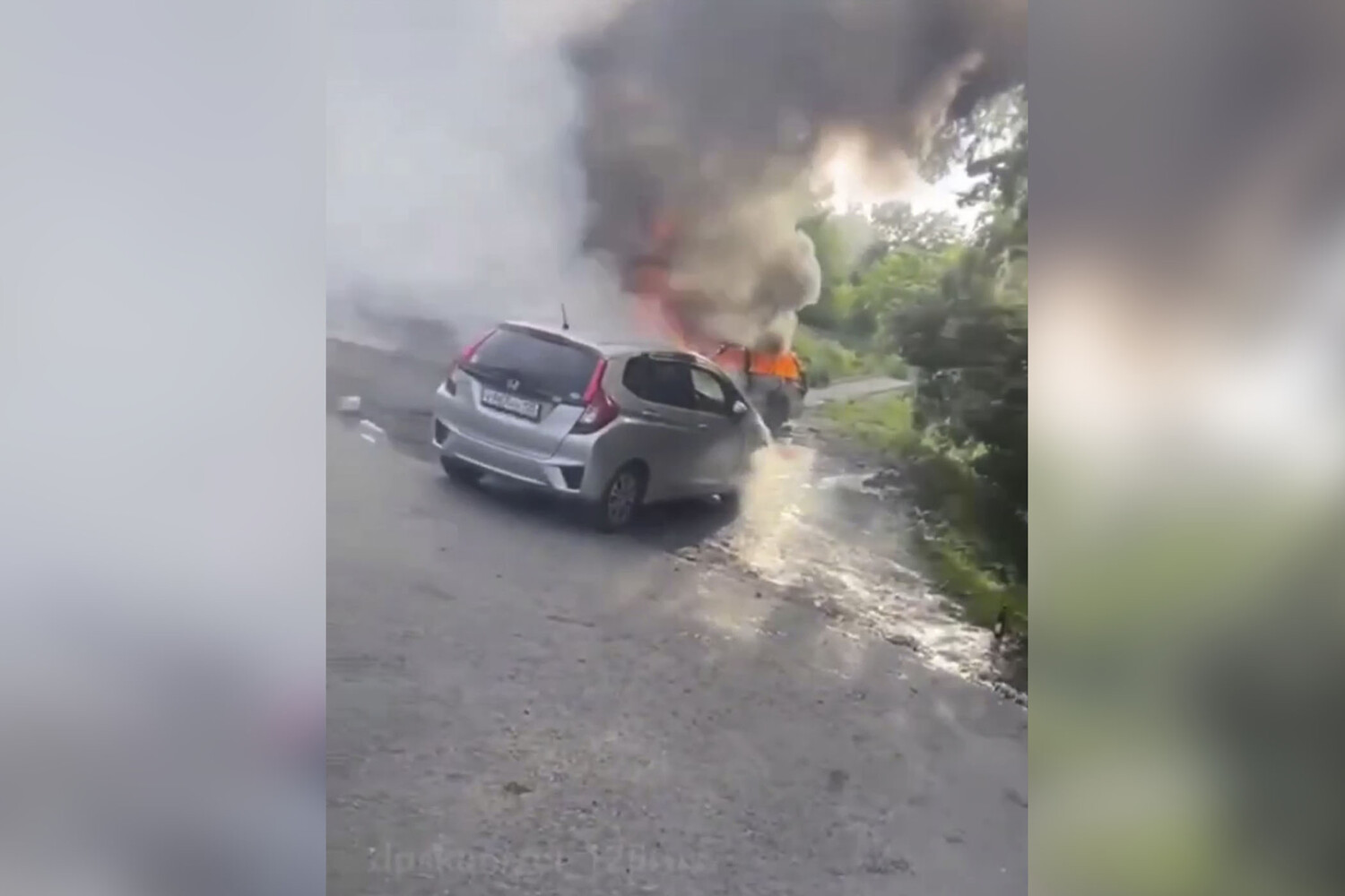 Возгорание произошло на Сахалинской улице. На кадрах с места происшествия видно, что пламя охватило весь автомобиль. На место происшествия прибыли пожарные и два реанимобиля скорой помощи.
