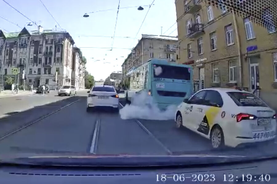 По его данным, автобус заискрился и загорелся на пересечении Большого проспекта и Гаванской улицы. На кадрах видно, что в этот момент общественный транспорт остановился у светофора на перекрестке. После этого его заднюю часть из-за сработавшей в моторном отсеке системы пожаротушения заволокло густым туманом.