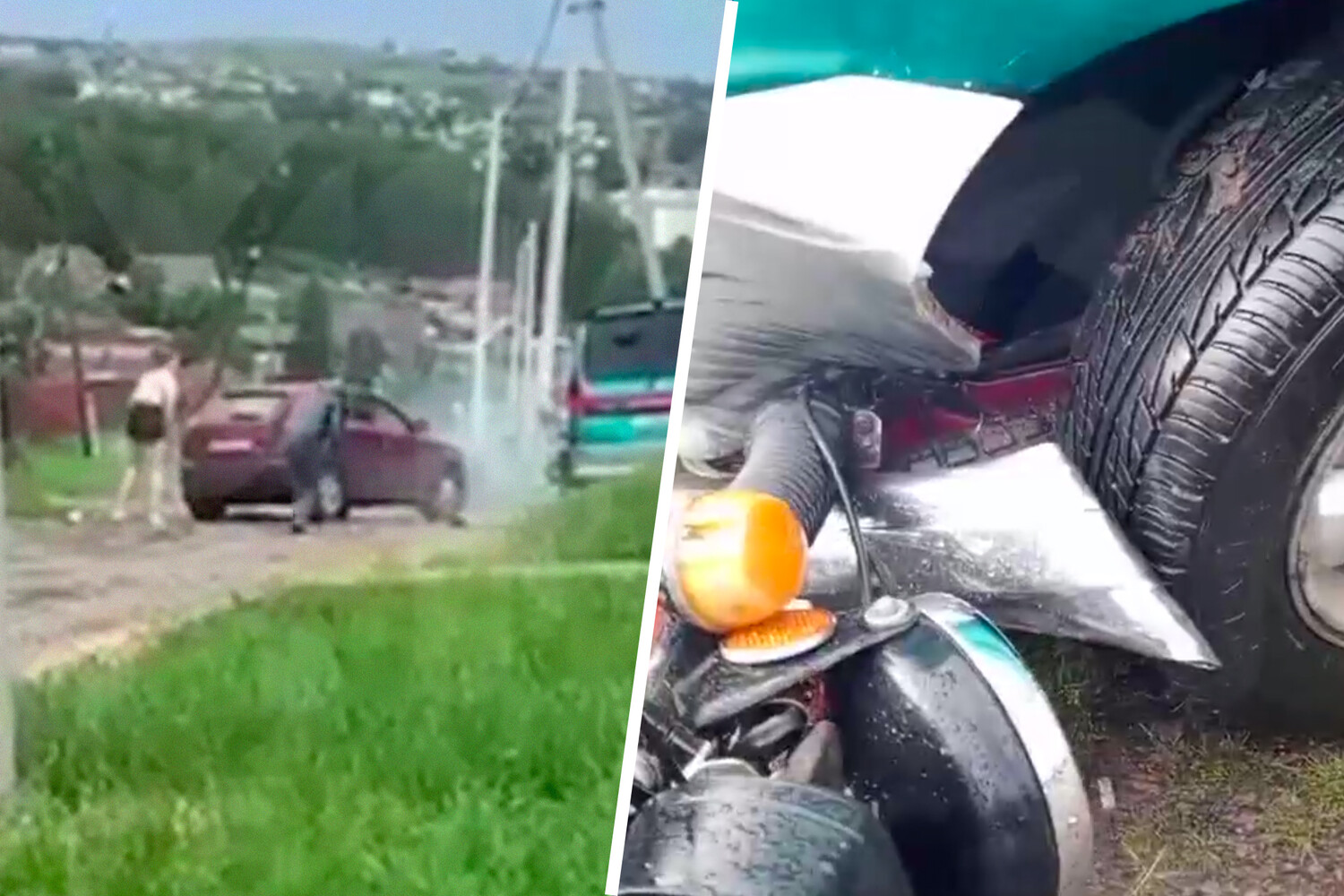 В Красноярском крае мужчина и женщина пытались оторваться от полицейской погони на мотоцикле и врезались в автомобиль. Инцидент попал на видео, которое опубликовал Telegram-канал Kras Mash.