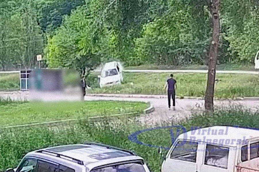 На кадрах видно, что внедорожник белого цвета на большой скорости движется по дороге, которая расположена на насыпи, значительно выше уровня близлежащего двора жилого дома. В повороте водитель не справился с управлением, скатился с откоса, обогнув растущее там дерево, и сбил пешехода, который шел вдоль газона. После этого автомобиль врезался в другое дерево. Утверждается, что пешеход после наезда остался жив, но получил травмы.