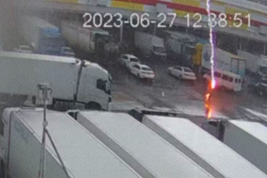 Инцидент произошел во время дождя на грузовой парковке овощной базы в хуторе Ленина. На записи видно, что молния ударила бегущего мужчину в область головы, после чего пострадавший упал на асфальт.