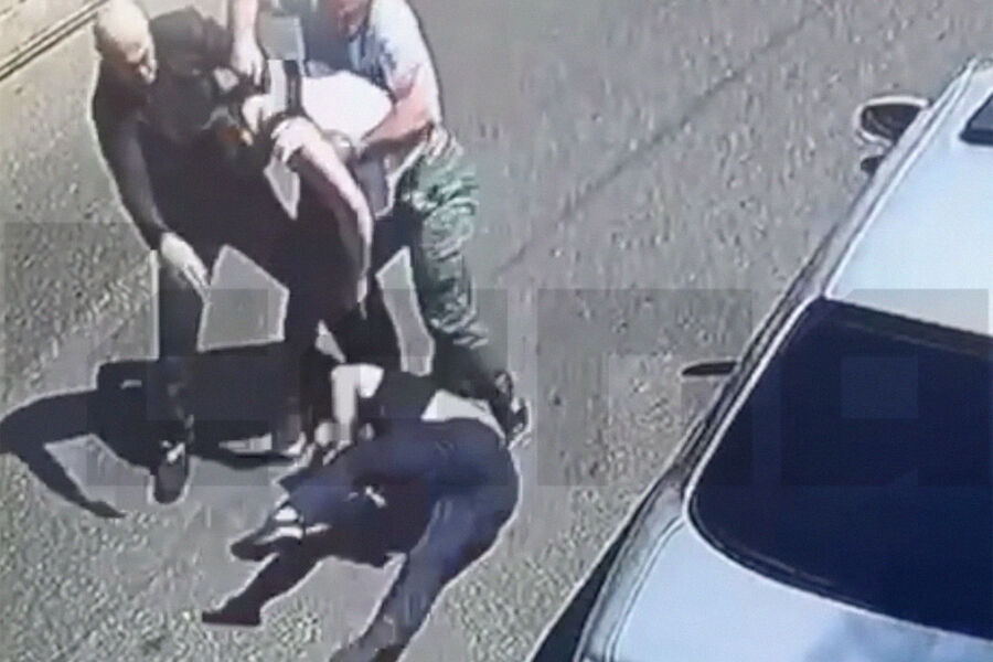 На кадрах видно, что на проезжей части мужчина в белой рубашке схватил другого мужчину в черной футболке и с силой бросил его на асфальт. Нападавшего в этот момент оттащили в сторону два человека.