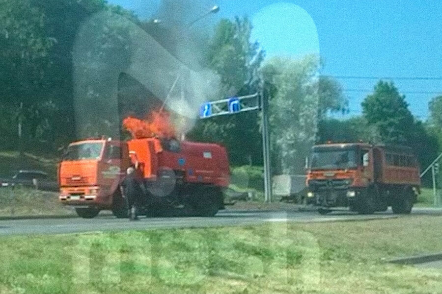 Пожар произошел на Дворцовом проспекте. На кадрах видно, что огонь вспыхнул в уборочной надстройке, установленной на шасси грузовика «КамАЗ», сразу за кабиной. К тушению пламени приступили прибывшие на место происшествия сотрудники МЧС. Следом за горящей машиной припаркован поливальный автомобиль на шасси грузового Mercedes.