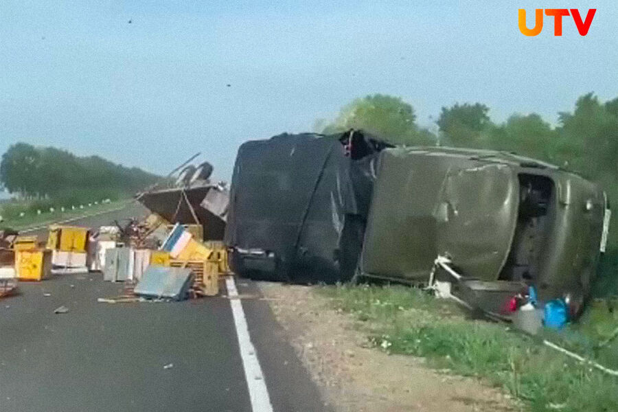 На записи видно, что грузовой автомобиль лежит на правом боку на обочине. Ульи и прочий груз, которые перевозили на прицепе, раскиданы по проезжей части.