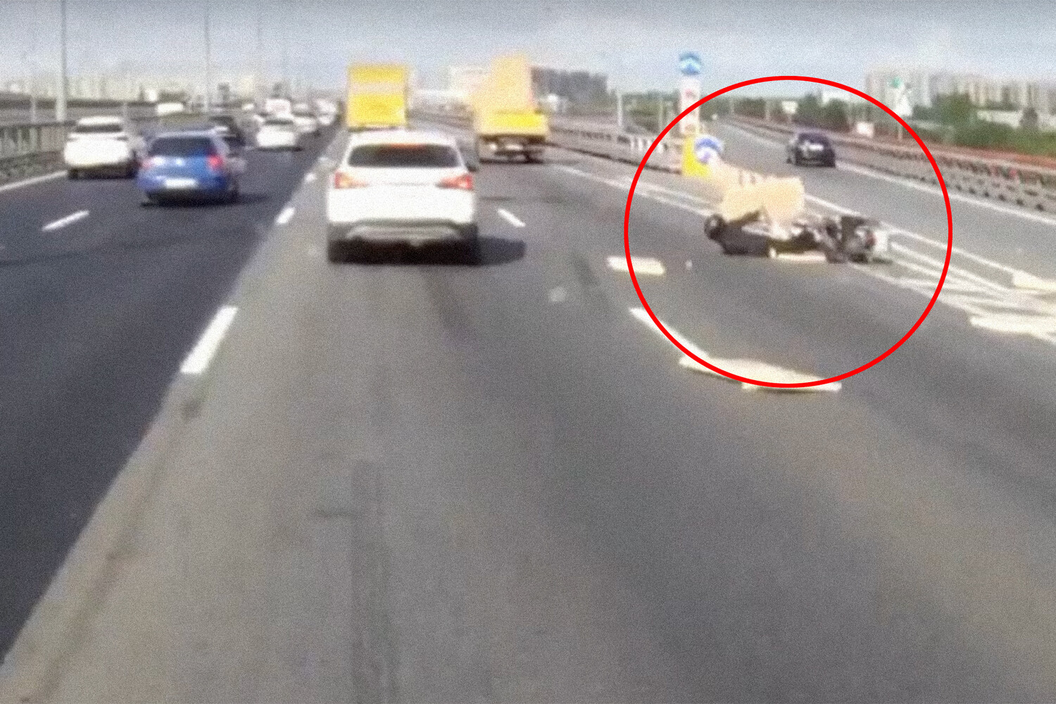 ДТП произошло утром на 65-м км КАД. На записи видно, как вылетевшая из грузового автомобиля пачка утеплителя попадает в мотоциклиста, после чего тот падает на асфальт.