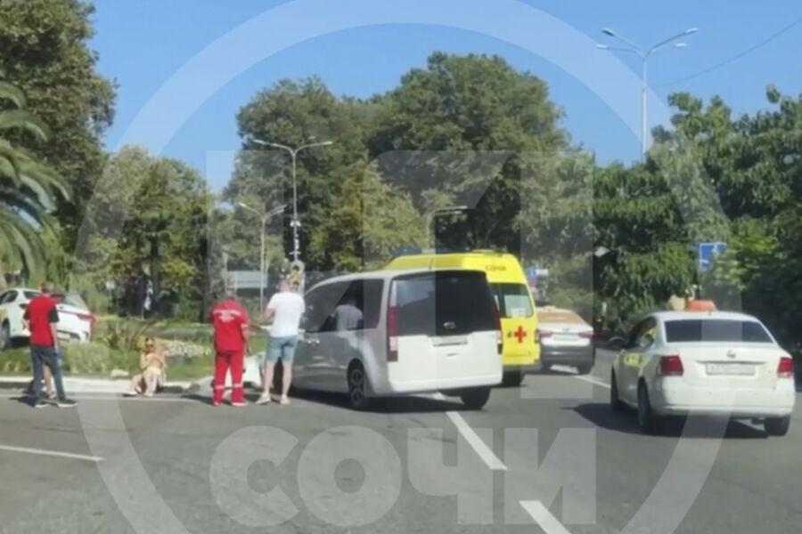ДТП произошло в центральном районе города на Курортном проспекте. По словам очевидцев, водитель минивэна при перестроении не убедился в безопасности маневра и столкнулся с машиной такси. От удара легковушка вылетела в клумбу и застряла под пальмой.