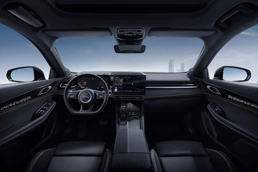 В салоне установлены 12-дюймовая цифровая приборная панель и центральный экран диагональю 13 дюймов. В список оснащения входят 25 датчиков, отвечающих за системы помощи и автономное вождение, бесключевой доступ, запуск двигателя с кнопки, подрулевые лепестки переключения передач, 19-дюймовые диски и прочие опции.