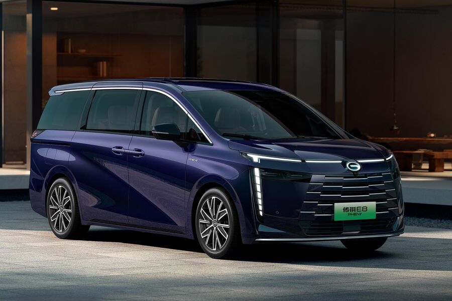 GAC Trumpchi E8 представляет собой однообъемный минивэн с трапециевидной решеткой радиатора, узкими светодиодными фарами и трехрядным салоном.