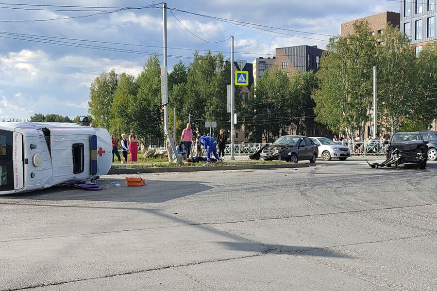 Инцидент произошел на перекрестке Красного проспекта и улицы Тюленина. Судя по видео, автомобиль скорой помощи проезжал перекресток, когда ему в бок на полном ходу врезался кроссовер Nissan X-Trail. От удара машина с медиками проехала еще несколько метров и опрокинулась на фонарный столб. Также в аварию попал автомобиль Lada Granta. У всех участвовавших в ДТП машин сильно разбиты кузова.