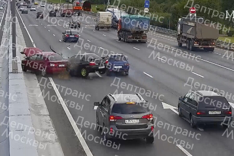 На кадрах видно, что красный седан Kia потерял управление после касательного столкновения с самосвалом в правом ряду. Вращаясь вокруг своей оси, Kia пересек проезжую часть МКАД справа налево и врезался в разделительный отбойник, задев при этом универсал Lada. После этого в Kia врезался черный седан Subaru, двигавшийся в левом ряду, а в Lada — еще один автомобиль.
