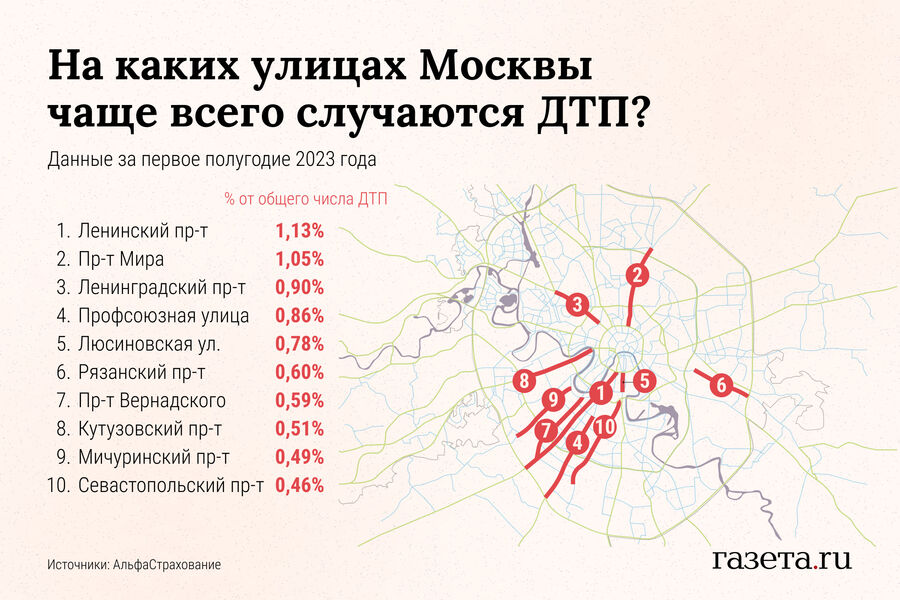 На Ленинском проспекте самая высокая доля аварий с клиентами компании — 1,13%. Следом за ним идет проспект Мира (1,05%), который растянут от Сухаревской площади в область и имеет много светофоров, а также насыщенное движение в сторону Ростокино, Мытищ и Королева.