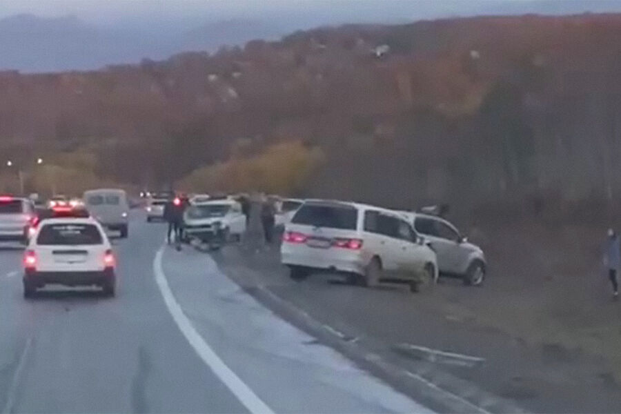 Один из автомобилей опрокинулся на бок, еще на нескольких видны следы столкновения. Очевидцы сообщают, что на трассе образовалась большая пробка. О пострадавших не сообщается. Еще три автомобиля свалились в кювет на трассе Елизово — Паратунка.