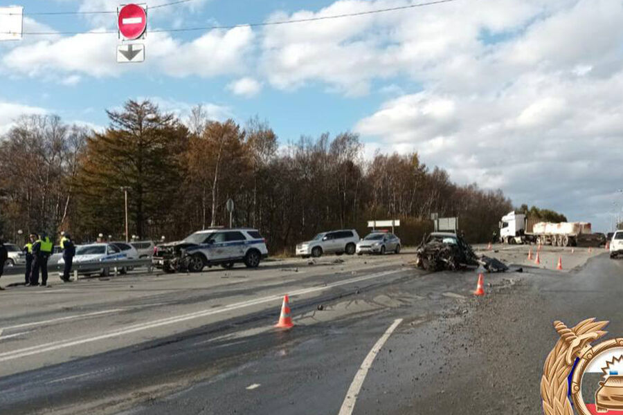 При выезде из города в районе 1-го Корсаковского переулка водитель Toyota, поворачивая налево, столкнулся с «КамАЗом». После этого автомобиль отбросило на служебный внедорожник ГИБДД. Нарушитель получил множественные травмы и был доставлен в больницу, другие участники аварии не пострадали. Полицейские устанавливают личность водителя иномарки.