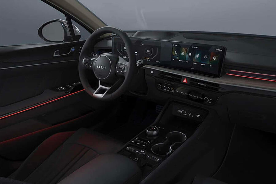 В салоне — панорамный изогнутый дисплей и оптимизированный блок кнопок, служащий для управления медиасистемой и климат-контролем. Обновленный K5 предлагается на корейском рынке с четырьмя силовыми установками. Это атмосферный бензиновый мотор 2.0 мощностью 160 л.с., турбомотор 1.6 (180 л.с.), а также 2,0-литровый мотор, работающий на пропане, и гибридная версия на основе агрегата того же объема.