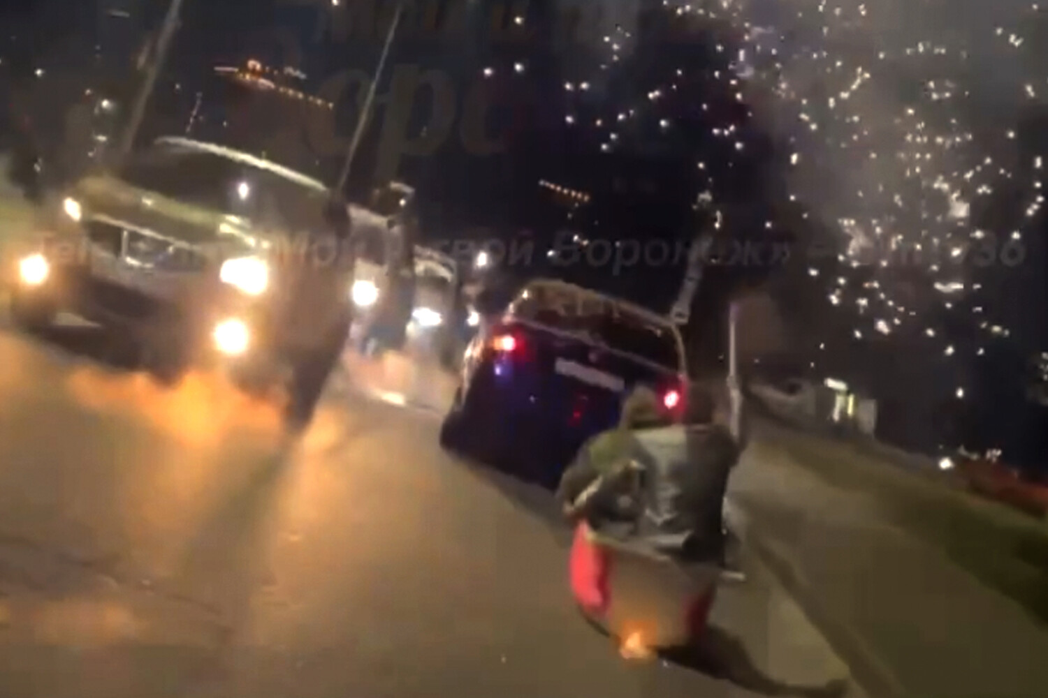На кадрах видно, что седан темного цвета движется по городской улице с включенной аварийной сигнализацией мимо плотного потока встречных автомобилей. К нему на тросе прицеплена ванна, в которой сидят два человека. Один из пассажиров держит в руке фейерверк, заряды из которого летят вверх.