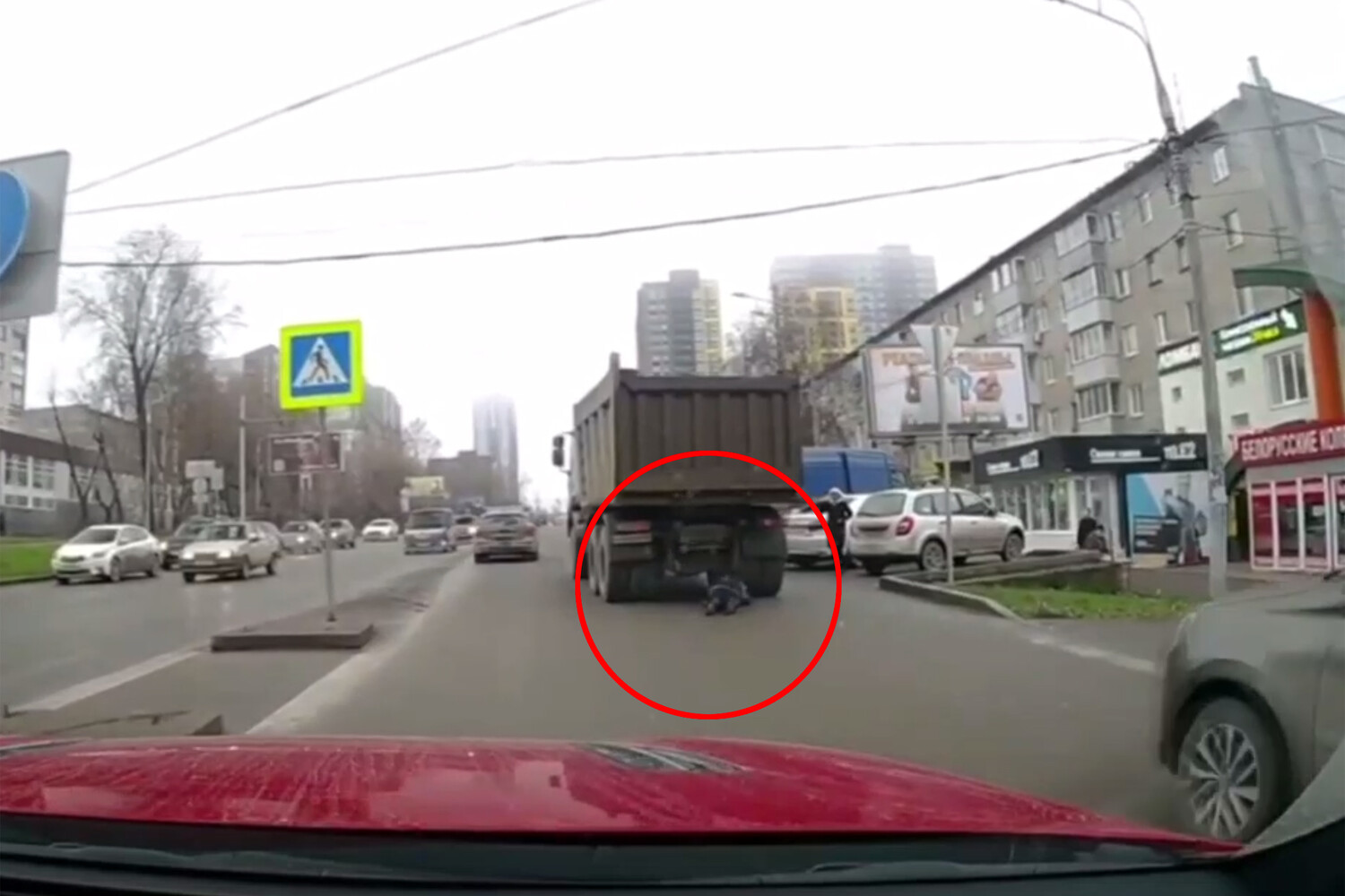 В Перми самосвал сбил женщину на пешеходном переходе и проехал над ней, не задев колесами. Об этом сообщает Telegram-канал «Пермь №1» и публикует видеозапись инцидента.