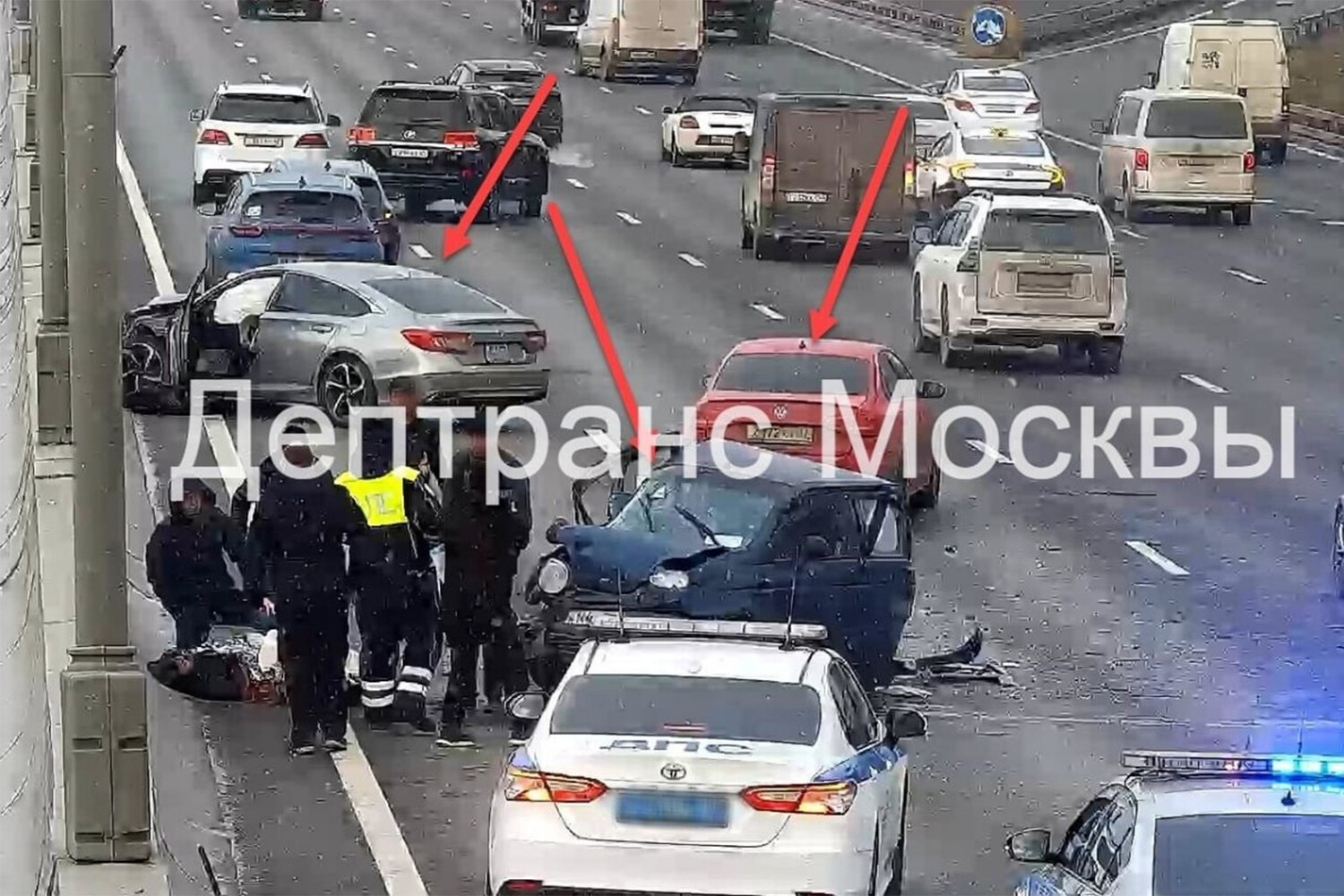 Информация о пострадавших уточняется. На фото с места происшествия видно, что в аварии участвовали минимум три автомобиля. Седан серебристого цвета остановился у разделительного отбойника трассы в левом ряду, у него разбита передняя часть. Синий хетчбэк Daewoo Matiz с сильными механическими повреждениями развернуло поперек дороги. Также в аварии повреждения получил красный седан Volkswagen.