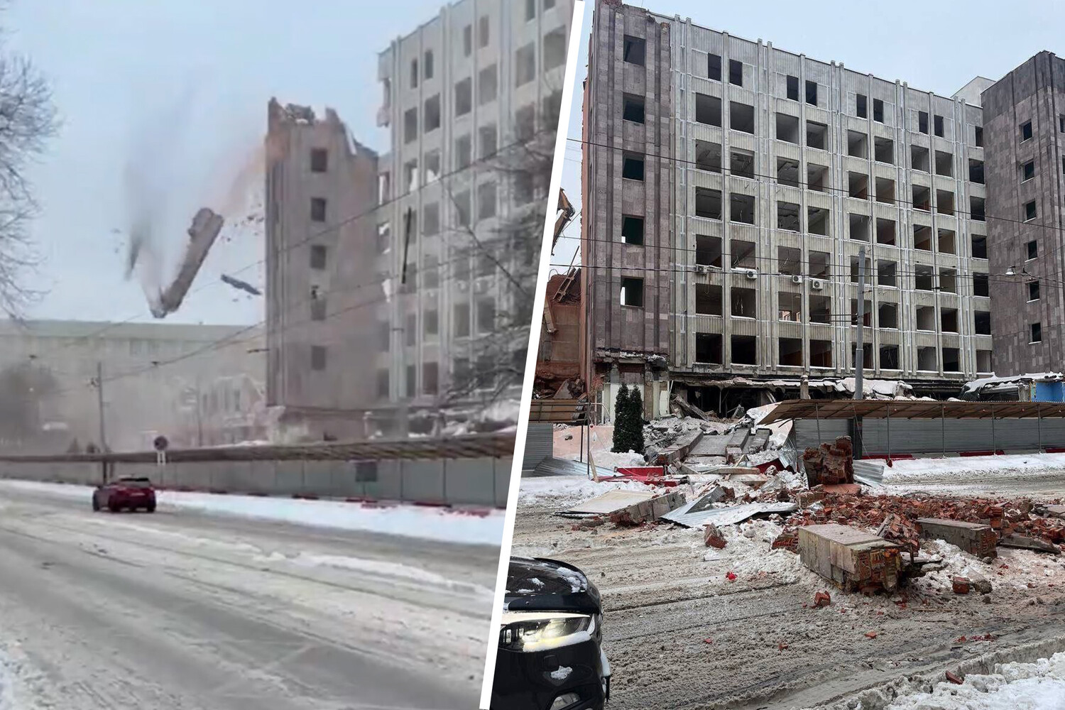 В Минаевском переулке рабочие занимаются сносом седьмого корпуса Российского университета транспорта. На кадрах видно, как большая часть кирпичной стены отделяется от здания, ломает ограждение и падает на проезжую часть прямо перед проезжающим мимо автомобилем. Дорогу завалило обломками, никто не пострадал.