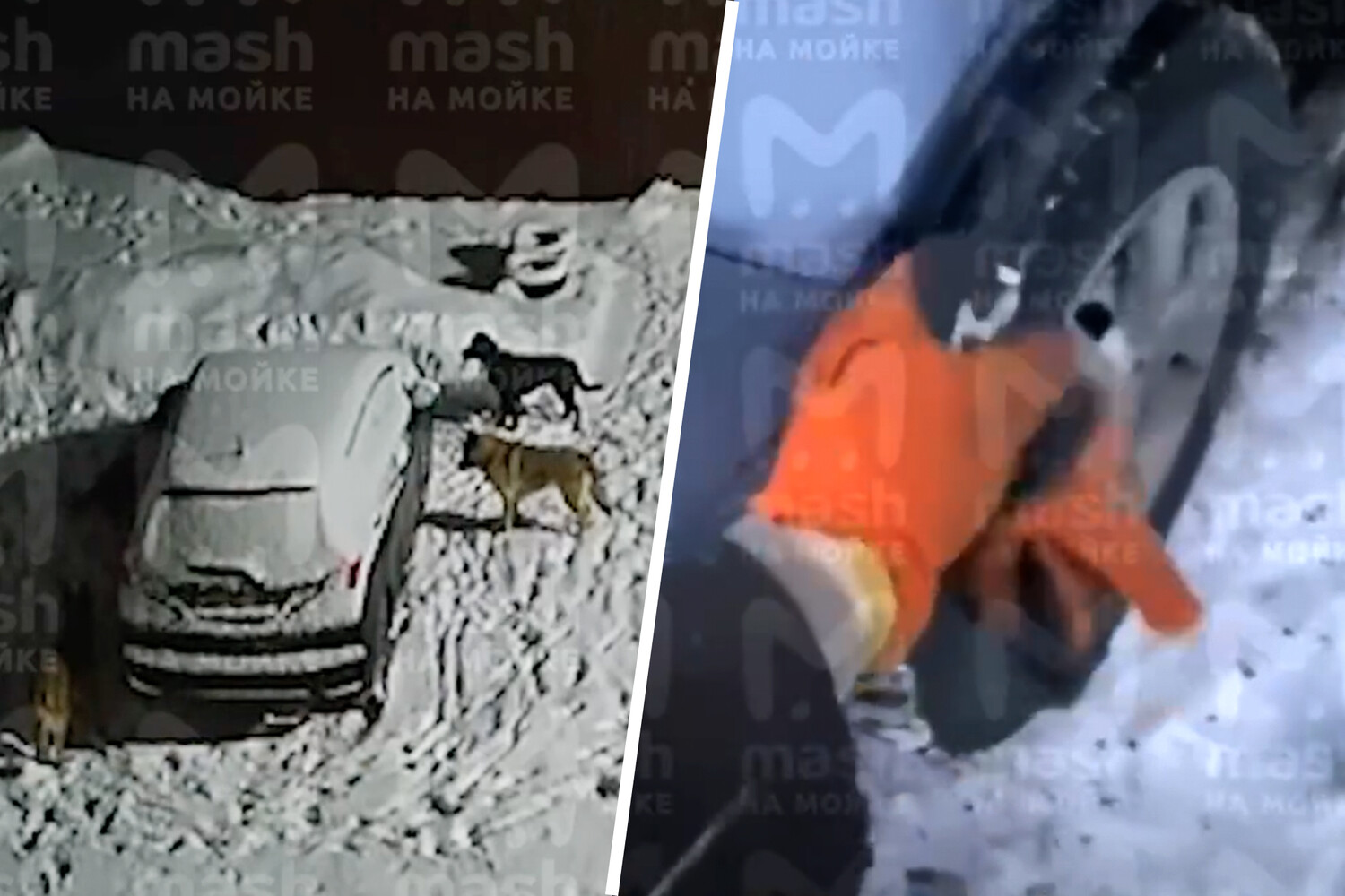На видеозаписи инцидента видно, что в ночное время автомобиль окружили не менее пяти собак.