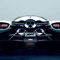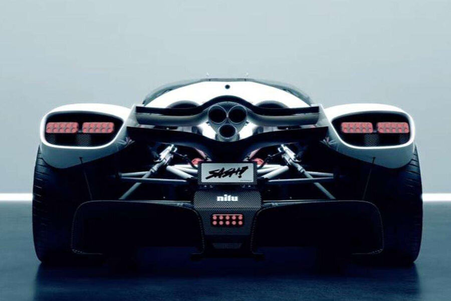 В задней части кузова автомобиля видны три патрубка выхлопной системы, машина отличается минималистичным дизайном. На видео с автомобилем также показаны подъемные двери спорткара и задний спойлер с тремя плоскостями.