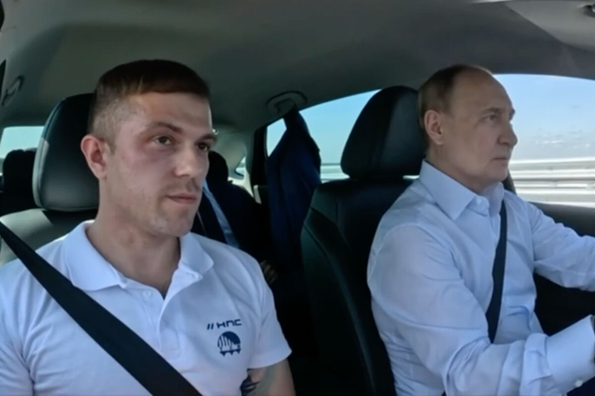 На опубликованном видео Путин садится в черную Lada Aura и едет по мосту «Волга».
