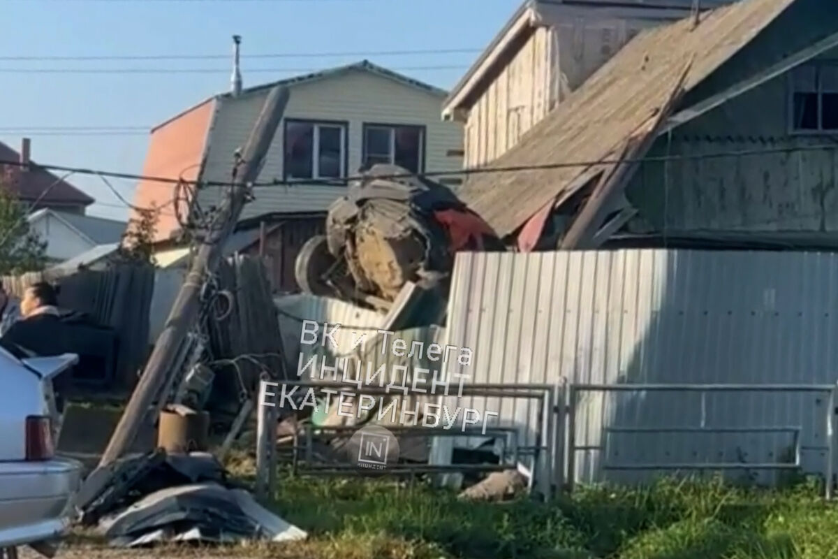 Обломки автомобиля пытаются достать из-за забора с помощью грузовика с краном-манипулятором, уточняет e1.ru в своем Telegram-канале.