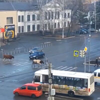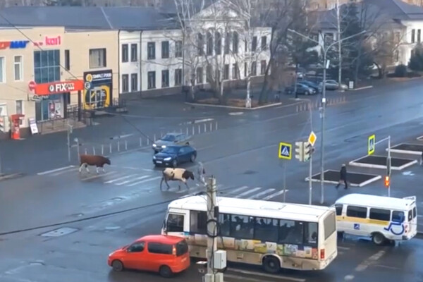 Животные двигались строго по разметке пешеходного перехода — зебре. Навстречу им, также по правилам, дорогу перешел мужчина. В тот же момент две женщины перешли дорогу навстречу коровам вне пешеходного перехода. Оказавшись за пределами проезжей части, коровы без пастуха направились на газон, разбитый на городской площади.