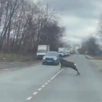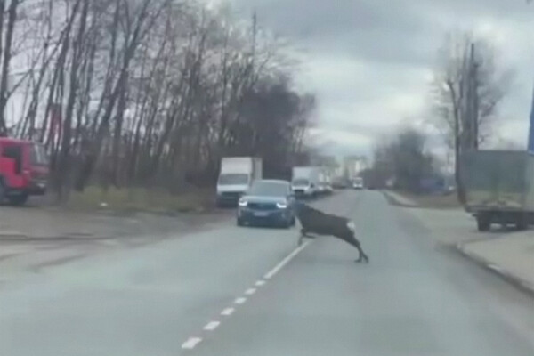 На опубликованных кадрах видно, как животное сначала бежит вдоль дороги, потом резко сворачивает и чуть не попадает под колеса легкового автомобиля, однако водитель успевает затормозить. Дальнейшая судьба животного неизвестна.