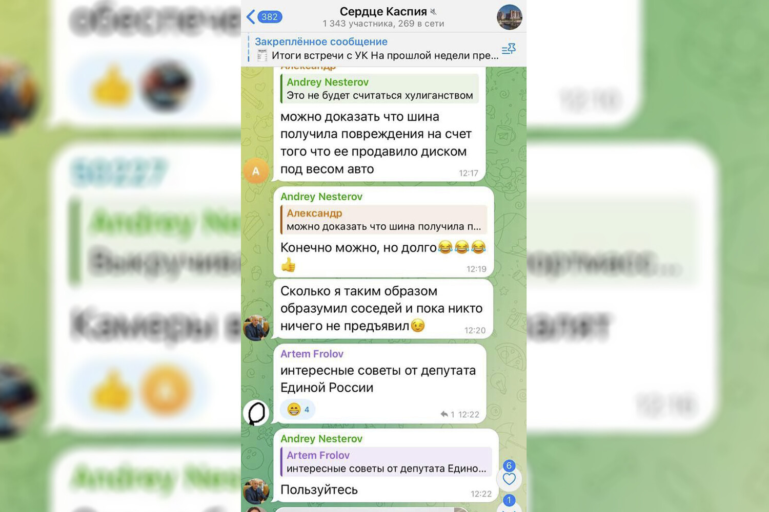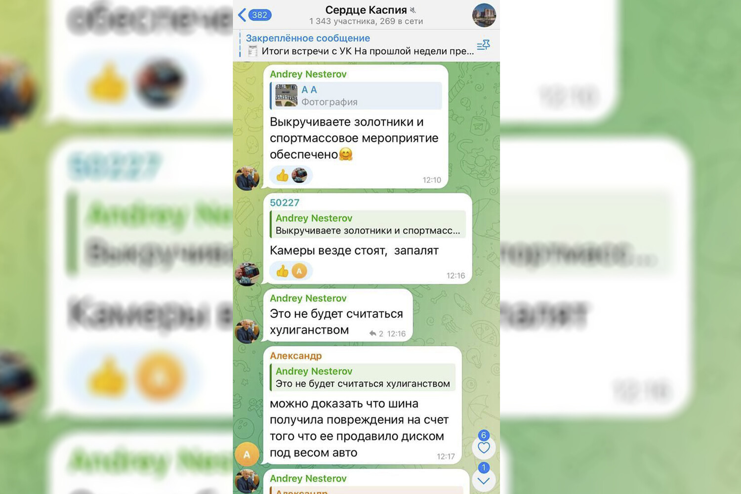 «Выкручиваете золотники, и спортмассовое мероприятие обеспечено. Это не будет считаться хулиганством», — написал в домовом чате Андрей Нестеров.