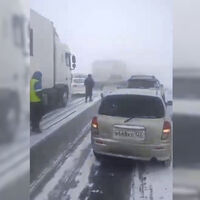 На опубликованном 40-секундном видеоролике видна очередь из минимум 50 машин, включая автобусы, большегрузные фуры и бензовоз.